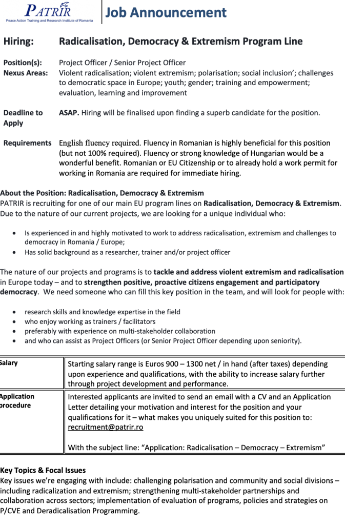 Hiring: Project Officer / Senior Project Officer – Radicalisation, Democracy & Extremism Program Line Leave a Comment / Archive / By Alexandra Iacob
